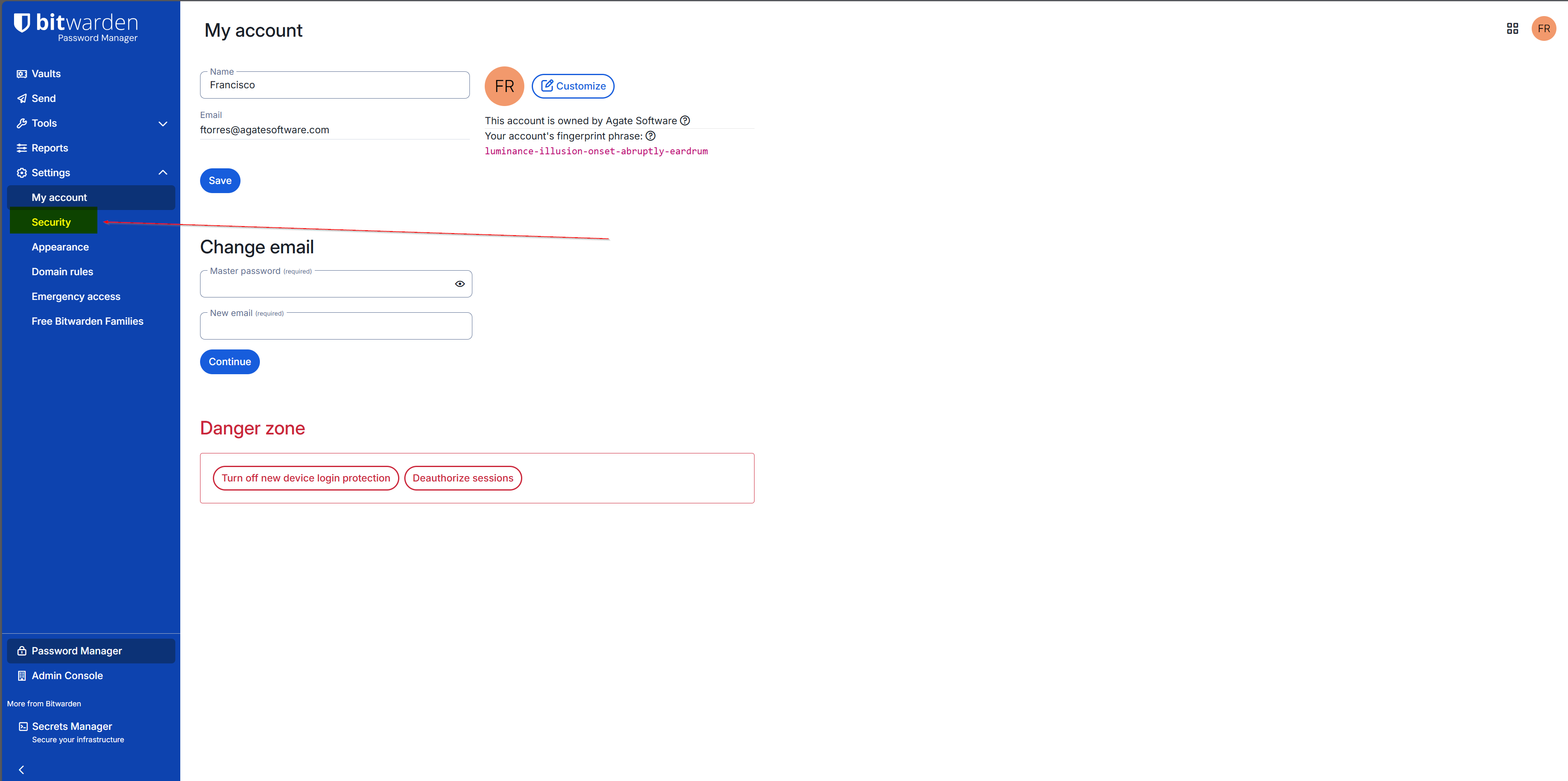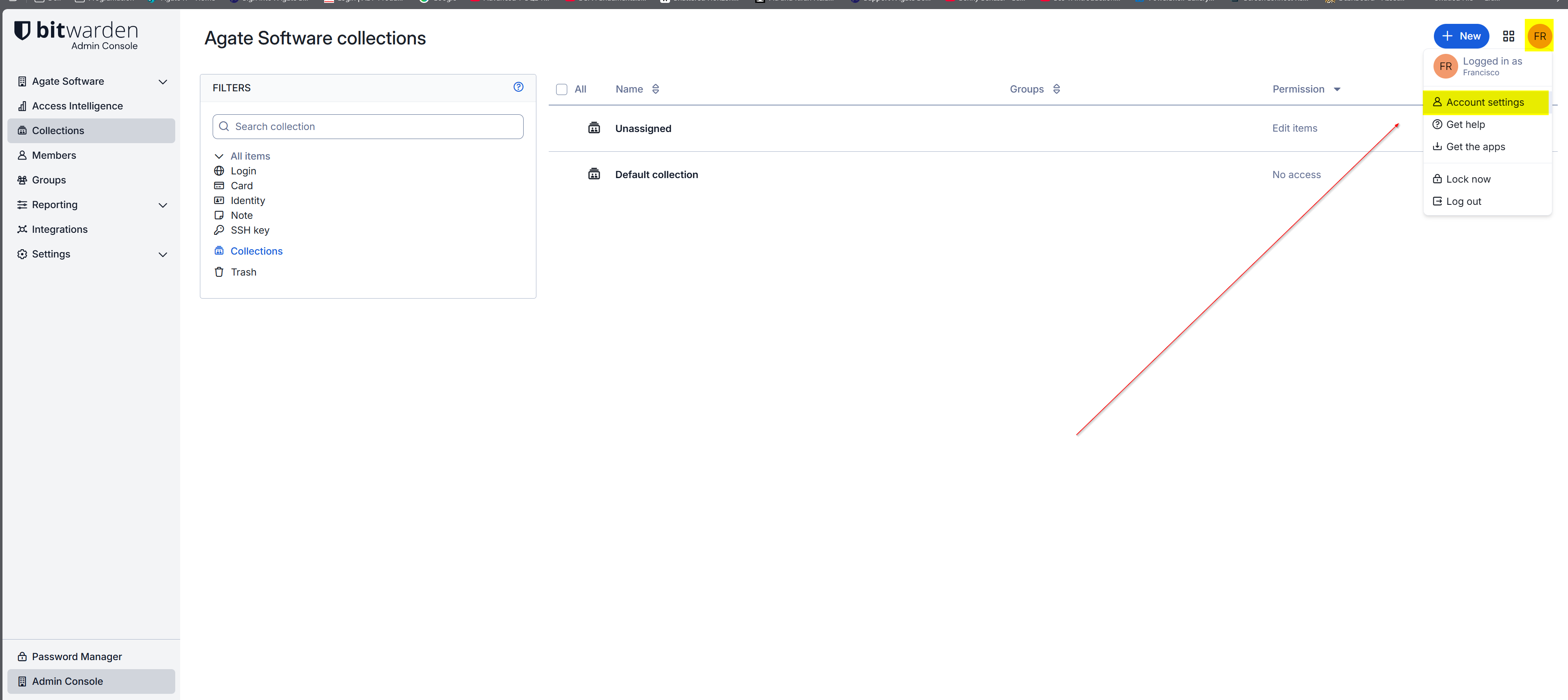 From the Bitwarden Admin Console head over to the upper right corner and click on the account circle. and click on 'Account settings'