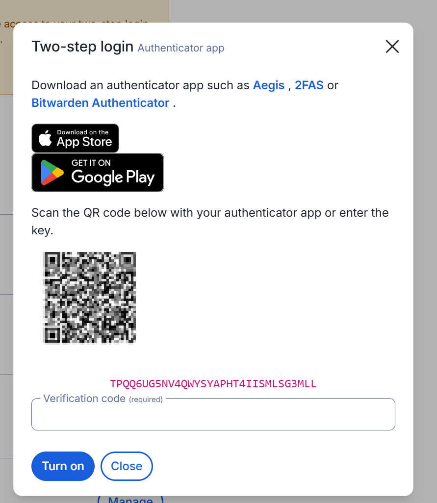 Enter the verification code generated on the Authenticator App, then click on 'Turn on'